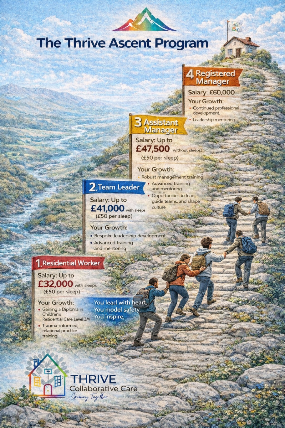 At Thrive Collaborative Care, we believe in growing together. Whether you’re stepping in with no qualifications but a heart full of care, or you’re ready to lead a team, our Ascent Program is built to lift you higher, with peer mentors, bespoke training, and real progression at every stage.